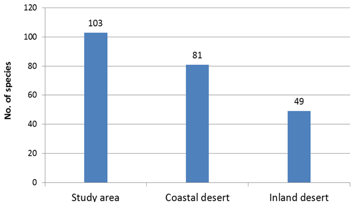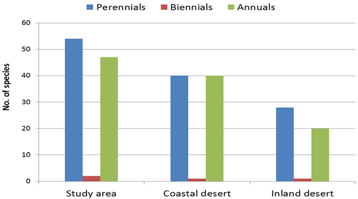 According to the duration (life-span) and as shown in Figure 3, the plant life in the study area can be classified into three major groups: annuals, biennials and perennials. As mentioned before, the total number of species recorded in the study area is 103 taxa. These species are distinguished into 47 annuals (45.63%), 2 biennial (1.94%) and 54 perennials (52.42%). In the costal desert habitat, 81 species were recorded and grouped into 40 annuals (38.83%), one biennial (0.97%) and 40 perennials (38.83 %). While, in inland desert habitat, 49 species were recorded and classified into 20 annuals (19.41%), one biennial (0.97%) and 28 perennials (27.18%).