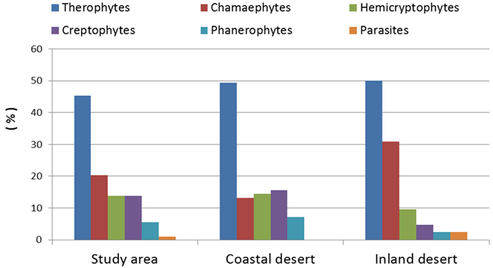 The majority of the recorded species are therophytes (49 species = 45.37%) followed by chamaephytes (22 species = 20.37), cryptophytes and then hemicryptophytes (15 species = 13.49 each) and phanerophytes attained value of 5.55% (6 species). The lowest value of life-forms is that of parasites which attained value of 0.93 % (one species). It is evident that, the percentages of the life-form spectra vary from one habitat to the other (Figure 4). In the coastal desert habitat, the recorded species (83) can be grouped into six types of life forms: therophytes (49.39%), cryptophytes (15.66%), chamaephytes (13.25 %), hemicryptophytes (14.45 %), and phaneropytes (7.22%). In the inland desert, the recorded species (42) can be classified into the following life forms: therophytes (50%), chamaephytes (30.95%), hemicryptophytes (9.52%), cryptophytes (4.76%), phaneropytes (2.38%) and parasites (2.38%). The previous results agreed with those reports by El-Demerdash, et al. [26 ]; El-Halawany, et al. [27 ] and El-Amier, et al. [28 ]. The dominance of therophytes over the other life forms seems to be a response to the local climate (annual rainfall), topography variation and biotic influence [29 ]. The relatively high values of chamaephytes, hemicryptophytes and cryptophytes may be attributed to the ability of species to resist drought, salinity, sand accumulation and grazing [30 , 31 ].