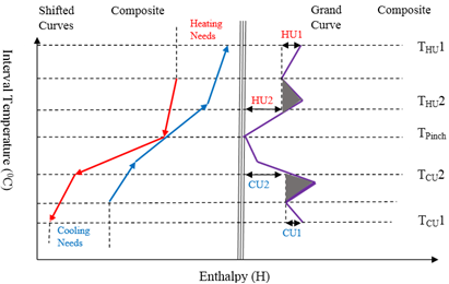 Linnhoff, et al. [9] developed the grand composite curve (GCC) to represent the utilities based on both the enthalpy and temperature levels. It is created by adjusting interval temperatures by and plotting that against cumulative enthalpy as shown in Figure 2. It gives the information on utility needs as well as temperature levels at which they are required. The tool is also useful for effective integration through profile matching and solving of multiple utilities problems in Pinch Analysis. Other sequential and simultaneous methods have been developed by researchers over the years to solve multiple utility problems [8].
