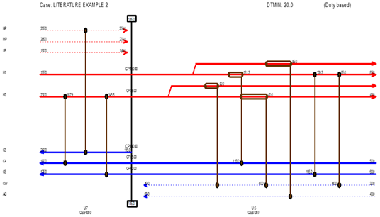 This problem involved 4 process streams, 3 hot utilities (steam at 3 pressure levels and 2 cold utilities; cooling water (CW) and air cooling (AC). The stream and cost data extracted from Shenoy, et al. [2] for the problem are presented in Table 3.