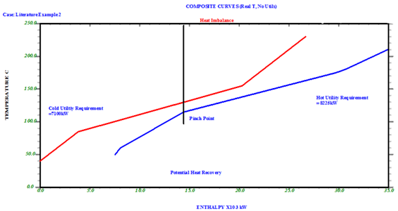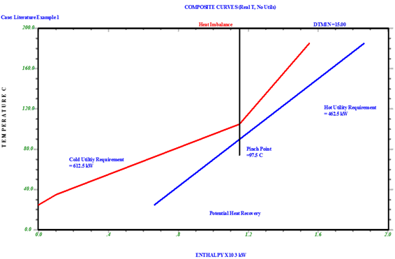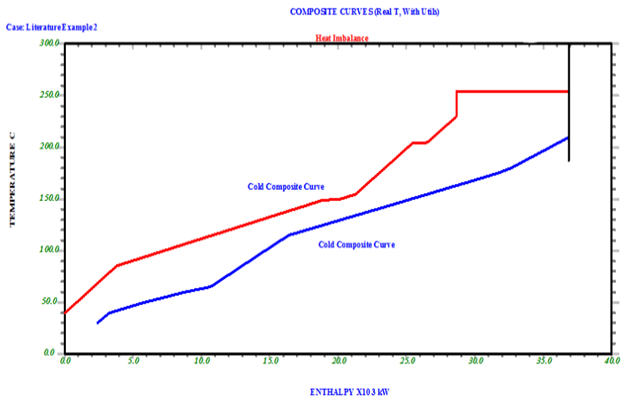 In Pinch Analysis, Composite curves are temperature – enthalpy graphs used to visualize the energy needs of a system by plotting the process streams as seen in Figure 1, for the purpose of determining the inter process heat transfer potential of a particular process. The hot composite curve representing the hot streams is plotted above the cold streams in a cold composite curve and the pinch point exists at the closest approach point between both curves and the vertical distance at this point is the minimum temperature difference () of the network. The horizontal difference at the top of the graph shows the hot utility needs of the system while the difference at the base shows the cold utility needs [8].