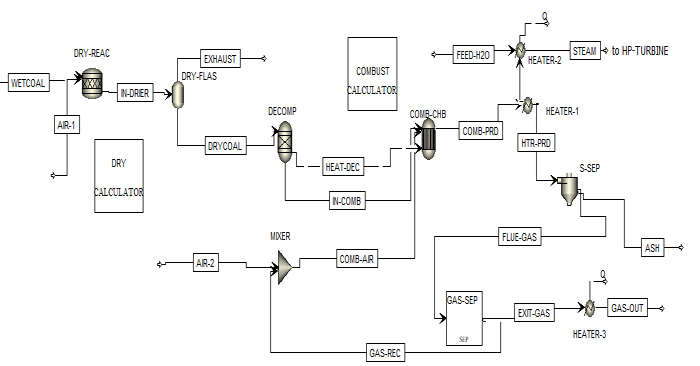 The combustion process is modelled using Gibb's reactor (COMB-CHB). The oxidant is a mix of O2 and CO2 from recovered flue gas. H2O, N2, O2, CO, CO2, Cl2, SO2, SO3, NO and NO2 are the primary by-products of coal combustion.