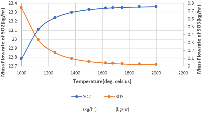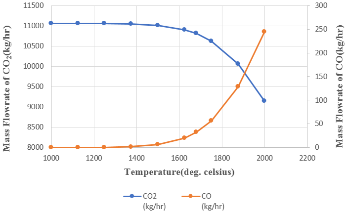 The mass flow rate of SO2 increases from 22.783kg/hr to 23.360kg/hr when the temperature is increased from 1000 oC to 2000 oC also the amount of CO2 decreases from 11063.8kg/h to 9145.9kg/h and the CO increases from 0.0034kg/h to 244.131kg/h. When the temperature is between 1500 oC to 1750 oC, the mass flow rate of CO increased a bit faster and at temperatures above 1750 oC, the increase was very rapid. The mass flow rate CO2 decreased spontaneously because CO2 is reduced by coal to generate CO at high temperatures.