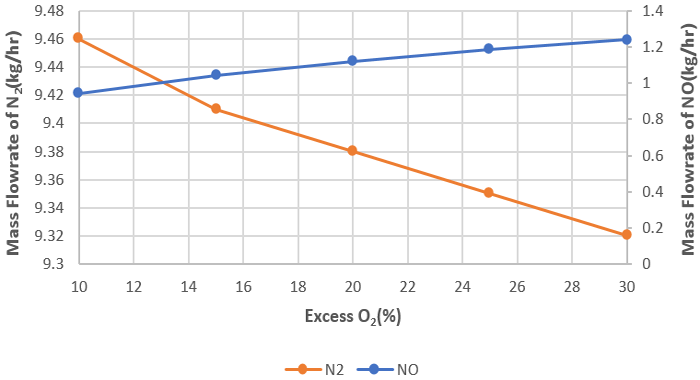 Figure-7. Effect of Excess O2 (%) on N2 and NO Formation.
