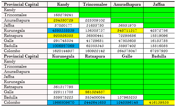 Table 1 indicates the traffic flows between each province in Sri Lanka. Green color cells showed the empty. Blue, yellow and colorless cells represented the high, moderate, and low traffic flows. We directly used Table 1 to obtain the minimum traffic flow model.