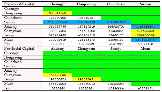 Table 2 indicates the traffic flows between each province in South Korea. Green color cells showed the empty. Blue, yellow, and colorless cells represented the high, moderate, and low traffic flows.