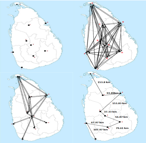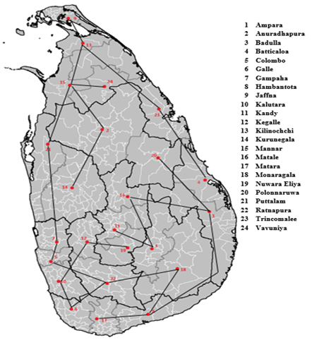Figure 7 indicates the minimum traffic flows in between every two plantations. Every edge is situated in the highly populated divisional sector of each district and represents the minimum traffic flow of the nearest plant. Here Figure 7 is directly based on traffic flows and minimum distances that we described in Table 1.
