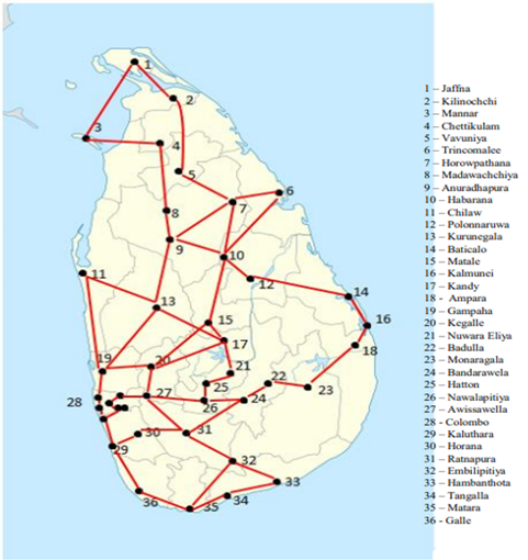Figure 6 represents the fiber optic backbone network in Sri Lanka. Here thirty-six plants are situated in Sri Lanka, and nodes represented those plants. Each connected line (edge) demonstrated the fiber optic connected path. This model is available in Sri Lanka at this moment.