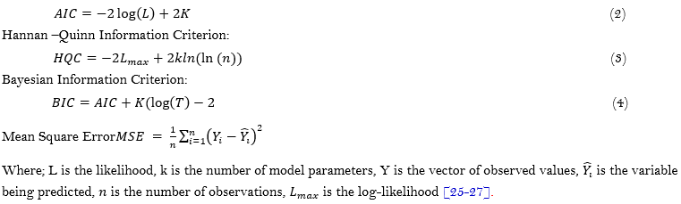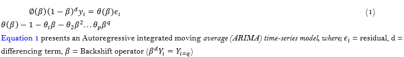 ARIMA modeling is applied to several types of time series, with or without seasonal components or trends, and to produce suitable forecasts values [15, 16]. The model is as follows;