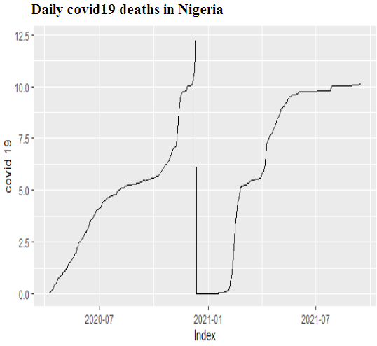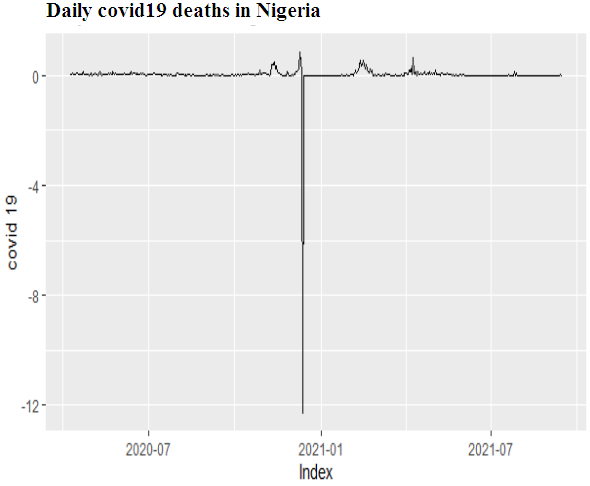 Coronavirus pandemic has turned into a worldwide danger to lives and security. The world overall is working diligently to discover a few answers for the battle against this destructive infection to decrease the number of passings. A few demonstrating and anticipating studies have been led on the topic utilizing so many time series models like ARIMA and Holt-Winters occasional smoothing procedures. Bezerra and Santos [4] thought about the presentation of ARIMA and Holt's direct remarkable smoothing models in the destruction of Coronavirus affirmed cases in Sudan, day-by-day readings of Covid-2019 confirmed cases dataset for the period 24th March 2020 to 10th t June 2020. The ARIMA model was selected as a suitable model rather than Holt parameter smoothing models. Djakaria and Saleh [5] contemplated the Coronavirus forecast model utilizing Holt-Winters outstanding smoothing, for a specific period. It was observed that utilizing Holt-Winters outstanding smoothing, the best prediction model is the one with smoothing boundaries α = 0.1 and γ = = 0.5 for pattern and irregularity individually, which gives the littlest MAPE worth of 6.14. Alabdulrazzaq, et al. [6] was keen on testing the exactness of the ARIMA procedure as the best fit model and for the forecast. The outcomes show that regardless of the powerful idea of the infection and consistent modifications made by the Kuwaiti government, the real qualities for the more often than not period noticed were well inside limits of the selected ARIMA model expectation at 95% certainty span. Benvenuto, et al. [7] proposed a basic econometric model that is useful in the expectation of the spread of COVID-19. ARIMA model was utilized to foresee the Johns Hopkins epidemiological information and to anticipate the pattern of the predominance and rate of COVID-19. Chintalapudi, et al. [8] model COVID-19 infected patient's dataset utilizing occasional ARIMA conjectures bundle in R. The expectation of contaminated patients recommended around 182, 757 and reported cases could be esteemed at 81, 635 toward the finish of May 2020 in Italy. Panda [9] applied ARIMA and Holt-Winters time series dramatic smoothing to foster a proficient 20-day ahead transient gauge model and anticipated the impact of COVID-19 pestilence. The displaying and estimating are finished with the openly accessible dataset from Kaggle as a point of view to India and its five states like Odisha, Delhi, Maharashtra, Andhra Pradesh, and West Bengal. The India anticipating uncovers that the COVID-19 spreading will fill further over the long haul. Swapnarekha, et al. [10] anticipated COVID-19 for the five most impacted territories of India like Maharashtra, Tamil Nadu, Delhi, Gujarat, and Andhra Pradesh utilizing the constant information. Utilizing the Holt-Winters strategy, a gauge of the quantity of affirmed cases in these states was produced. The examination shows that the proposed Holt-Winters model produces RMSE worth of 76.0, 338.4, 141.5, 425.9, 1991.5 for Andhra Pradesh, Maharashtra, Gujarat, Delhi, and Tamil Nadu, which brings about more exact expectations over Holt's Linear, Auto-relapse (AR), Moving Average (MA) and Autoregressive Integrated Moving Average (ARIMA) model. Singh, et al. [11] looked at between the distinguished top 15 nations for affirmed cases, deaths, and recuperation, and a high-level ARIMA model was utilized for foreseeing the COVID-19 infection spread directions for the following 2 months. The noticed anticipated values showed that the affirmed cases, deaths, and recuperations will twofold in every one of them noticed nations except China, Switzerland, and Germany. It was additionally seen that the demise and recuperation rates were increased quicker when contrasted with affirmed cases throughout the following 2 months. Zangiacomi-Martinez, et al. [12] assessed the exhibition of the Holt's model to figure the everyday COVID-19 announced cases from the date of the main COVID-19 case to April 25, 2020, as the preparation time frame, and April 26 to May 3, 2020, as the trial in Brazil and three Brazilian states. Finding uncovers Holt's model can be a satisfactory momentary determining technique assuming their suppositions are satisfactorily checked and approved by specialists. Sharma and Nigam [13] dissected the development example of COVID-19 pandemic in India from March 4 to July 11 utilizing relapse investigation (remarkable and polynomial), auto-backward incorporated moving midpoints (ARIMA) model as well as dramatic smoothing and Holt-Winters models. It was found that the development of COVID-19 cases follows a power system of (t2, t, . . .) after the remarkable development. The investigation further discovered that the ARIMA (5, 2, 5) model is the best-fitting model for COVID-19 cases in India. Mingzhe, et al. [14] examine the spreading, pattern, and momentary figure of the new Corona-virus in Hubei Province. From the information demonstrating, utilizing ARIMA and Holt Model it was seen that the plague circumstance in Hubei Province has fundamentally finished after May, however the scourge circumstance in the United States has become more extreme after May, so the Holt model and the ARIMA model are additionally exceptionally proper in foreseeing what is going on in the present moment. A summary of the reviewed literature revealed that no study on modeling of COVID-19 deaths in Nigeria had been carried out using the combination of error trend and seasonal (ETS) exponential smoothing techniques and ARIMA model. To address the gaps indicated above this study sought to determine the trend and fit an appropriate time series model to the COVID-19 reported death cases in Nigeria.