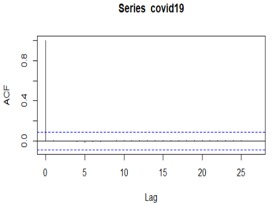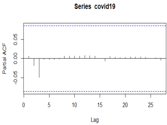 From Figure 1, it can be observed that the data are not stationary following the presence of a possible upward trend from July 2020 to November 2020 and a downward trend from late November 2020 to February 2021. [3]. The graph presented in Figure 2 shows the differenced covid-19 dataset. Stationarity was achieved by differencing the covid-19 data and this is confirmed by the result of the Augmented Dickey-Fuller test with p-value = 0.01 (see Table 2) which is highly significant at all level of significance. First differencing was performed to remove the trend component of the covid-19 dataset. The result of the correlogram (ACF and PACF plot) presented in Figure 3 and 4 shows that, there is similarity between ACF and PACF with both showing a rapid decline and an exponential decay from lag 0. Hence, the model is not an Autoregressive (AR) or moving average (MA) but an ARIMA model. The only model that can be deduce from this model is ARIMA (0,1,0) (see. Figure 4, i.e. PACF plot). In Table 3, the coefficients of ARIMA (0, 1, 0) model indicates that, AIC = 879.56, MAE = 0.06546, log likelihood = -438.78, BIC (Bayesian information criterion) = 883.89 = 0.2767.