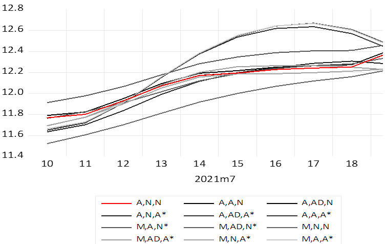 Exponential smoothing combines error, trend, and seasonal (ETS) components in computing smoothing. Each term is the combination of either additive, multiplicative, or left out of the model. It is a popular local measurable algorithm utilized for time-series predicting. It is suitable for a time series dataset with seasonal components and prior assumptions. ETS calculates weighted means over all variables in the time series data as its prediction. The weights are exponentially diminishing after some time rather than the steady weights in the direct Moving Average (MA) technique. The weights are subject to a constant parameter called a smoothing parameter. Several ETS exponential smoothing techniques are featured in the literature. Most of these suggested techniques were applied in our study. Moreover, an exponential smoothing technique from previous studies in the literature that provides an effective performance was also introduced in this study [17-24] . Table 1 shows the existing error trend and seasonal exponential smoothing techniques criteria.