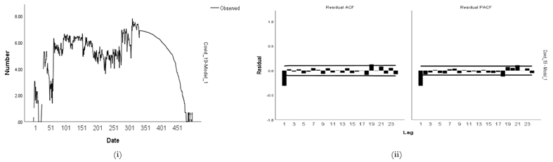 Figure 7. (i) The Standardized Residual Plot of the ARIMA (0,1,0) model and (ii) The standardized Residual plot for the ACF and PACF Respectively. |