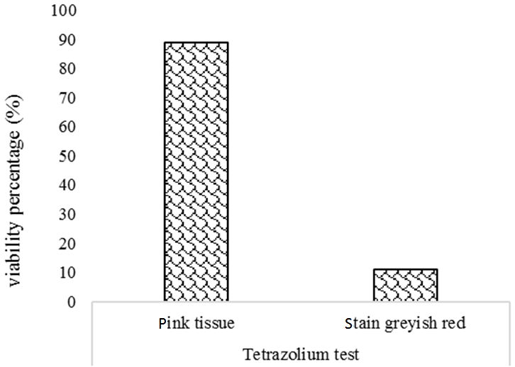 Based on the seed viability test (Tetrazolium chloride), the seeds Kochia prostrata are 89% viable and have potency Figure 1. Vivid textures in bright pink to red, uniform texture colouring and Non-living tissues are reddish-brown, and the tissue is stained. The vigour of the seed indicates how healthy and vigorous it is. As a result of this test, it is feasible to estimate how much the plant will produce in response to certain pests and weather circumstances.