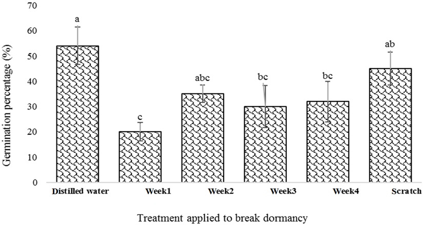 The results showed that distilled water (control, not scarification, not cold stratification) treatment had a significant effect on germination percentage and other germination indices that the highest germination percentage (54%) was related to distilled water treatment Table 2, Figure 2.
