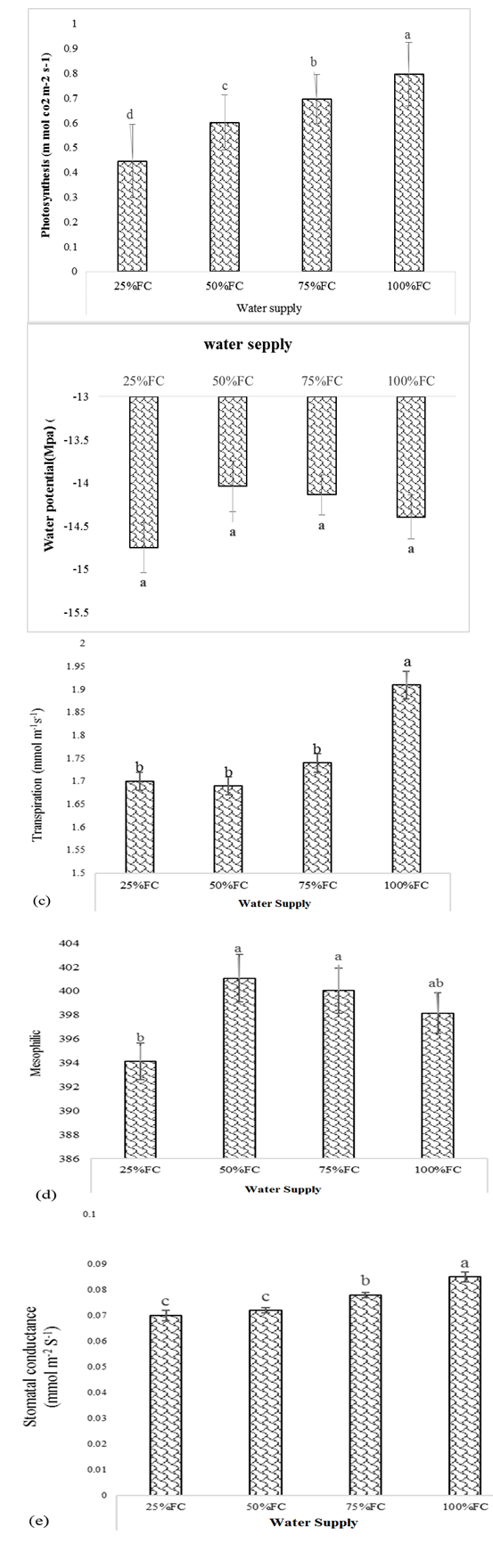 The study results of drought stress on plant physiological features show that drought stress's effect on the analyzed species' physiological traits differs statistically significantly.   The lowest rates of photosynthesis, stomatal conductance, transpiration, and mesophyll were observed in the 25% stress treatment (0.38 mmol m-1s-1, 0.070 mmol m-1s-1, 1.70 mmol-2s-1, and 394.13, respectively) Figure 3. All traits except the plant water potential parameter under drought stress (drought stress did not significantly affect this parameter) have a statistically significant difference Table 3. According to the findings, the analysis of the effect of drought stress treatment on the physiological traits of the plant showed that this treatment, respectively, the amount of F drought stress (F = 981.30; P = 0.000), had the most significant effect on the amount of plant photosynthesis (The minimum rate of photosynthesis was 0.38 in 25% stress and the maximum rate of photosynthesis was 0.85 mmol m-1s-1 in 100% stress Figure 3). In measuring the plant water potential parameter, the stress effect did not significantly impact plant water potential Figure 3. The analysis results for plant transpiration showed that drought treatment (F = 24.78; P = 0.001) was significantly affected at a 1% level. They showed a significant effect on the drought stress orifice conductance parameter (F = 22.08; P = 0.016 Figure 3) at a 1% level. Analysis of the effect of stress treatment on mesophilic traits showed: that drought stress (F = 7.31; P = 0.0001) was significant at a 1% level (Table 3, Figure 3). The highest photosynthesis values, stomach conductance, and transpiration are related to non-selective treatment (0.85 mmol m-1s-1, 0.085 mmol m-1s-1, 1.91 mmol m-2s-1, respectively), and the lowest water potential was observed in the treatment of 75% water stress (-14.21 M pa).