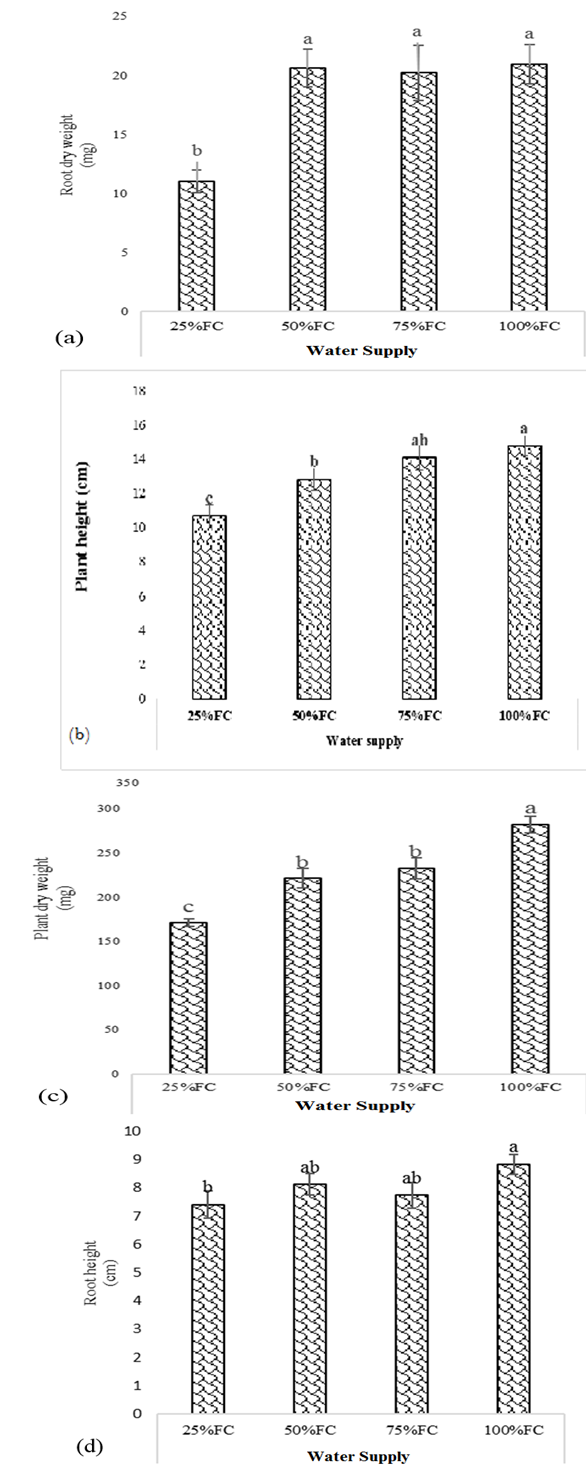 Plants use morphological, physiological, and metabolic changes to mitigate drought's harmful consequences and respond to stress Babaei, et al. [41]. Ivania, et al. [42] discovered that water restriction substantially impacts the growth of parsley aerial parts. The degree of stomatal resistance, water potential, transpiration, and relative moisture content is essential to plant physiology variables influencing plant water relationships [43]. By reducing the water available in the soil, the first option for plants is to close the pores against stress. Closure of the pores leads to disruption of the carbon dioxide uptake process and damage to the Calvin cycle, followed by a reduction in photosynthesis [44]. Hence, our results support previous findings, showing that increasing drought stress reduces photosynthesis. Drought and dehydration cause chloroplasts to break down and chlorophyll to decrease, which reduces plant photosynthesis [45, 46]. The stomatal often responds to drought immediately after any significant change in leaf water potential and relative leaf moisture [47]. Therefore, the decrease in relative leaf moisture can be considered an indicator of drought stress. This study indicates that with increasing drought stress, the physiological traits of the plant, such as photosynthesis, transpiration, and stomatal conduction, showed a significant decrease that indicates a high correlation of these variables with drought stress. The high sensitivity of photosynthesis to drought is due to the closure of pores and reduced access of chloroplasts to carbon dioxide. Low cell water potential directly affects the structure of components involved in cellular photosynthesis Sadati, et al. [48]. Zoghi, et al. [49] investigated photosynthesis, transpiration, and stomatal conductance Seedlings of Quercus castaneifolia   decreased significantly when they were under severe water deficit (40 percent FC). In our study, under severe water deficit (25 percent FC), the physiology traits of Kochia prostrata decreased significantly. The analysis of the data revealed that drought stress has a substantial effect on the morphological traits of Kochia prostrata species. As drought stress increased, the average weight of shoots decreased, indicating a significant difference between land treatments, with the maximum average weight of plants weighing about 282.70, associated with 100% treatment. which is consistent with many results of previous research [41, 50]. As drought stress increased, the average weight of shoots decreased, indicating a significant difference between land treatments, with the maximum average weight of plants having a weight of about 282.70, associated with 100% treatment. Since vegetative growth in plants is affected by various factors, one of these critical factors is the amount of water available to the plant [51]. This theory showed that it is a suitable strategy, and using this method, the plant can continue to absorb nutrients with minimal energy expenditure [52]. This study showed that plant height was also affected by different levels of drought stress. With increasing drought stress, the average length of aerial parts showed a decreasing trend, which caused a significant difference between treatments. It became dry. The highest mean shoot length was related to the treatment of 100% of field capacity with 14.77 cm, and the lowest value of plant length was associated with the treatment of 25% of field capacity with 10.67 cm (Figure 4) which is the first noticeable effect that drought stress has on plants. We can point to the decrease in plant height and smaller leaf size, which our studies are consistent with the investigation. According to the results, drought stress significantly affects root length characteristics. Therefore, the highest average root length, 8.84 cm, is related to drought stress treatment of 100% of field capacity. Alternatively, the lowest value of root length, 7.41 cm, is associated with applying 25% of field capacity. In a 2010 study by Rodríguez-Gamir, et al. [53]. The reduced yield of safflower species under water stress was attributable to reduced leaf area under various salinity treatments, which decreased light absorption by plants and, as a result, reduced dry matter in follows, However, in the present study, although the morphological characteristics of the plant decreased with increasing drought stress, moderate to severe drought stress of 50-75% did not have a significant effect on the morphological characteristics of the plant. A study by Rassam [54] examined the effects of four levels of drought stress on Hyssopus officinalis medicinal plants. This study showed that although drought stress harmed the morphological characteristics of the studied species, the lack of significant differences between mild stress and control treatment of the studied traits shows that Hyssopus has relative resistance to drought stress. This study's results were consistent with those of the current study.