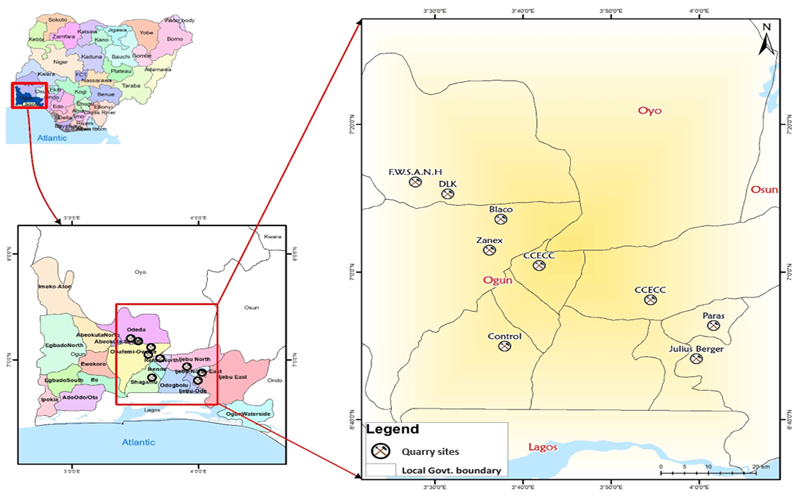 Figure 1. Location of selected quarry sites in different local government areas in Ogun state.