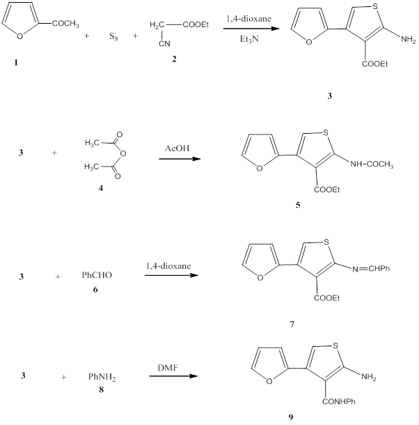 Thiophene and its derivatives constitute one of the major classes in heterocyclic chemistry. They have been shown to have interesting biological properties such as antiproliferative [1, 2] and anti-inflammatory [3]. Several synthetic routes for polyfunctional fused or pendant pyridine systems have been reported in the literature. They mainly involve intramolecular cyclization [4, 5] multi component intermolecular cyclization [6] metal assisted coupling [7] microwave assisted coupling [8, 9] or cycloaddition [10] azo electronic coupling [11] regioselective hetero Diels-Alder [12] and internal Mannich reaction [13]. They have been used in a wide variety of biological applications [14]. In this work we are demonstrating the synthesis of biologically active thiophene derivatives using 2-acetylfuran as the key starting reagent.