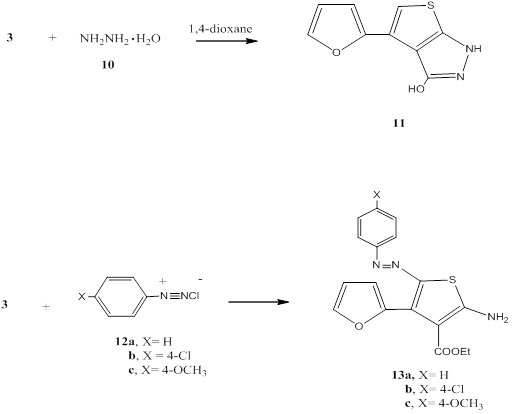 The reaction of compound 3 with hydrazine hydrate (10) gave the thieno[2,3-c]pyrazole derivative 11. The latter product was formed through the first formation of the hydrazide derivative followed by ammonia elimination. The structure of compound 11 was based on the analytical and spectral data. Thus, the 1H-NMR spectrum showed the presence of a singlet a δ 6.03 ppm indicating the presence of the thiophene H-5, a multiplet at δ 7.30-7.37 ppm for the furan protons and two singlets (D2O exchangeable) at δ 8.28, 10.16 ppm for the NH and OH groups, respectively.