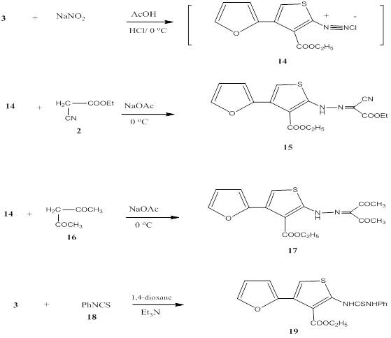 On the other hand, the 2-amino group present in compound 3 is capable for diazotization. Thus, the cold solution (0-5 ºC) of compound 3 in acetic/hydrochloric acid reacted with sodium nitrite solution to give the intermediate 2-diazonium salt 14. The latter coupled with either ethyl cyanoacetate (2) or acetylacetone (16) to afford the hydrazo derivatives 15 and 17, respectively. On the other hand, the 2-amino group in compound 3 reacted with phenylisothiocyanate (18) to give the 2-N-phenylthiourea derivative 19 (Scheme 3).
