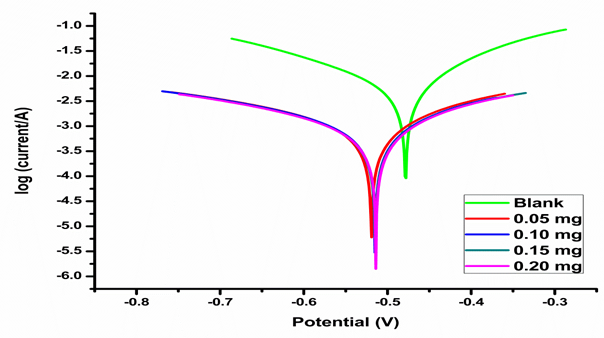 The polarization character of MS in 3 M HCl solution without and with expired Fluoxymesterone drug of four different concentrations was analyzed and obtained plots are shown in the Figure 2. The results of Tafel plots are shown in the Table 2. The addition of 0.05 mg, 0.1 mg, 0.15 mg and 0.2 mg of expired Fluoxymesterone drug concentration reduces the corrosion current density values. The MS corrosion current density values are inversely proportional to expired drug inhibitor concentration. The decrease in the corrosion current density values with an increase in the expired Fluoxymesterone drug is a clear hint of corrosion inhibition property of expired Fluoxymesterone drug on the MS surface in 3 M HCl solution. Further, the corrosion potential (E corr) values are within 85 mV compared to the blank solution, which indicates that, expired Fluoxymesterone drug act as mixed corrosion inhibitors. It is also observed that, the cathodic and anodic Tafel slope values are not directed towards any direction, which also supports the mixed corrosion inhibition property of expired Fluoxymesterone drug.