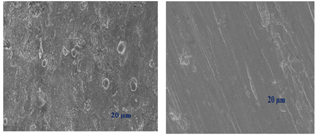 Figure 4 (a, b) shows the SEM images of MS in the absence and presence of the expired Fluoxymesterone drug in 3 M HCl solution. Rough surface of MS was observed in the absence of expired Fluoxymesterone drug in 3 M HCl solution, which is due to direct contact of hydrochloric acid ions on the MS surface. Smooth surface observed in the presence of 0.2 mg of expired Fluoxymesterone drug is due to the formation of protective film on the MS surface in 3 M HCl solution.