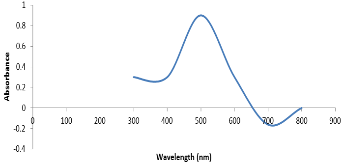 The formation of Cu/Ni BMNPs was first noticed based on the visual change in color of the reaction mixture at room temperature from sky-blue to light blue within 15 min. This was followed by UV-Vis spectroscopy frequently used to characterize the BMNPs. The UV–Vis absorption spectrum of the synthesized Cu/Ni BMNPs is shown in Figure 1. The maximum absorption peak was shown at absorbance of 0.07 with corresponding wavelength (λmax) at 500 nm. The change in color of the reaction mixture was also due to surface Plasmon resonance phenomenon which provides a convenient indication of the formation of Cu/Ni BMNPs. Less is known on the characterization of these NPs using this equipment, however, the λmax is consistent with 510nm reported by Ramasamy, et al. [18] and Gopinath, et al. [7] both for Au/Ag BMNPs.
