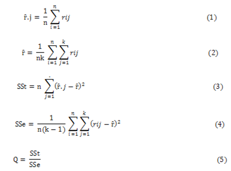 To find the values of weights for our 5 main criteria was used Friedman test as a special vector initially. The framework of the Friedman test has been made up as a matrix besetting some columns and rows to process the values via SPSS [26]. In the matrix of [rij] n the entry rij is the rank of Xij within block i according to Equations 1 to 5. The test statistic is calculated by Equation 5.