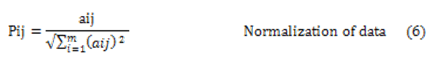 In the next step to figure out the ideal positive solution (A+) and the ideal negative solution (A-) were employed the Equations of 8 and 9. To carry out the values were highlighted the selected values at each column of the matrix. The best values for positive indicators were assumed as the largest values (Vij), and for negative indicators, the smallest values. The worst values for the positive indicators are the smallest values, and for the negative indicators, are the largest values.