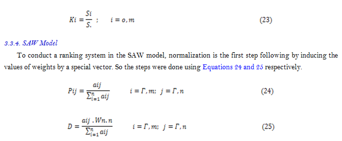 WASPAS model also needs normalization and in the following the weighing process. To do the ranking system Equation 26 was applied to normalize the data. The calculation of the relative importance of the alternatives accomplished via Equations 27 and 28. The value for λ was assumed around 0.5 in Equation 29 [28].