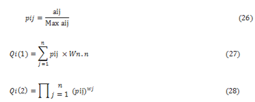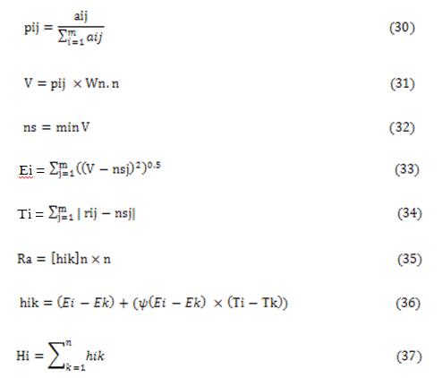 This method also needs to set up a matrix of data (1) initially. The procedure posed to compute the ranks values undergo some steps such as (2) distinguish ideal (AI) and anti-ideal (AAI) solutions (3) according to Equations 38 to 39. B offers a benefit group of criteria, while C offers a non-benefit group of criteria. (4) Normalization process using Equations 40 to 41. Xij and Xai include the elements of the matrix. (5) Assign the values of weight into the matrix according to Equation 42. (6) Utility degree (division between the sum of Normalized and Weighted (NW) values in the matrix of data to the sum of maximum NW values in the matrix) identification using Equations 43 to 45. (7) Determination of the utility function of alternatives f (Ki) associated with AI and AAI, Equations 46 to 48.