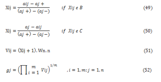 To rank the defined criteria along with certain alternatives the MABAC model encompassed some steps such as (1) Normalization of the composed matrix via Equation 49 to 50. The symbols of aj+ and aj- introduce the elements of the initial decision matrix. (2) Set up the weighted matrix via Equation 51. (3) Calculation of the approximate border area matrix using Equation 52. Vij is the element of the weighted matrix, m introduces the number of alternatives. (4) Ranking of options via the sum of the distance of options of the border approximate areas considering Equation 53. By Equation 53 n presents the number of criteria [23].