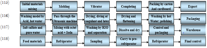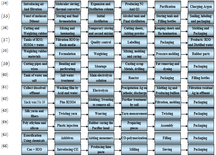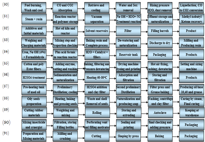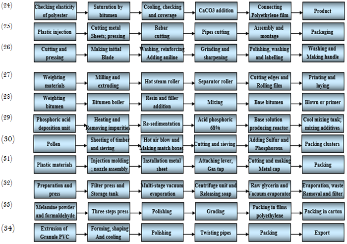 Up to down: Animal Feed from Agricultural Waste (1), Animal drugs (2), Ammonium Chloride (3), Antifreeze (4), Baby carriage (5), Blood Powder (6), Buds of different seeds (7), Barium carbonate (8), Braided wax plates (9), Calcium carbonate (light and active) (10), Calcium carbide (11), Clothes hanger and pin (12), Disinfectants (13), Fiberglass boat (14), Fiberglass pieces (15), Fragrant aromas (16), Glass- strip away (17), Glucose from starch (18), Healthy Soap (19), Helmet (20), High pressure hoses (21), Household Lighting Candles (22), Insecticide coil (23), Isolator (24), Kitchen lighter (25), Knife with injectable handle (26), Adhesive plaster (27), Lining materials and insulating gas pipes (28), Liquid fertilizer (29), Matches (30), Mechanical disposable lighters (31), Medicinal glycerin (32), Melamine dishes (33), Metal flexible hose pipes (34), Nitrobenzene (35), Potassium chloride (36), Printing ink (37), Rubber parts (38), Shoe wax (39), Soft polyurethane foam (40), Starch from wheat (41), Throw-away crockery (42), Tooth brush (43), Detergents (Shampoo, etc) (44), Welding glasses (45), Insecticide spray containing flavoring materials (46), Acetic acid ester (47), Phthalic anodic esters (48), Calcium stearates (49), Boric acid (50), Hydrochloric acid (51), Chromic acid (52), Zinc oxide (53), Oxygen; Ar and N2 (54), Alcohol from beet molasses (55), Types of gaskets (56), Acid and distilled water (57), Rubber plugs (58), Sprinkler (59), Sodium hypochlorite (60), Recycling silver from film and its solution (61), Industrial Paraffin (62), Raw silk fabrics (63), Pacifier (64), Unsaturated polyester (65), Bleach powder (66), Electrostatic coating (67), Tri-calcium phosphate (68), Hub and rubber ball (69), Synthetic leather of polyurethane (70), Gum stick (71), Wood gum (polyvinyl acetate) (72), Shoe adhesive (73), Medical and sanitary adhesives (74), Toothpastes and health cosmetics (75), Hexagon pen (76), Pen (77), Plugs and screws head (78), Diethyl ether (79), CO2 (80), Epoxy resin (81), Alkyd resin (82), Bakelite resin (83), Resin; urea formaldehyde gum (84), Dyeing and printing of fabrics (85), Transformer Oil (86), Used motor oil and grease recycling (87), Drying oils (88), Rubber profiles (89), Insecticide spray (90), Rubber glass head (91), Canopy (92), Agricultural liquid pesticides (93), Zinc sulfate (94), Sodium sulfate (95), Alkyl benzene sulphonation (96), Sodium sulfite (97), Sodium sulfide (98), Sodium silicate (99), Drop irrigation system (100), Glasses frames (101), Oil filter recycling (102), Thermos and ice box (103), Industrial and consumable taps (104), Teflon strips (105), Hair comb (106), Glass artifacts (107), Industrial crystals (108), Spectacle glass (109), Chinese insulator (110), Ceramic magnet (111), Tape (for electronic equipment) (112), Fruit concentrate (113), Shuttered windows (114), Hygiene products made of artificial stone (115), Household, industrial and medical gloves (116), Metal octet (117), Refrigerator above zero for crops (118).