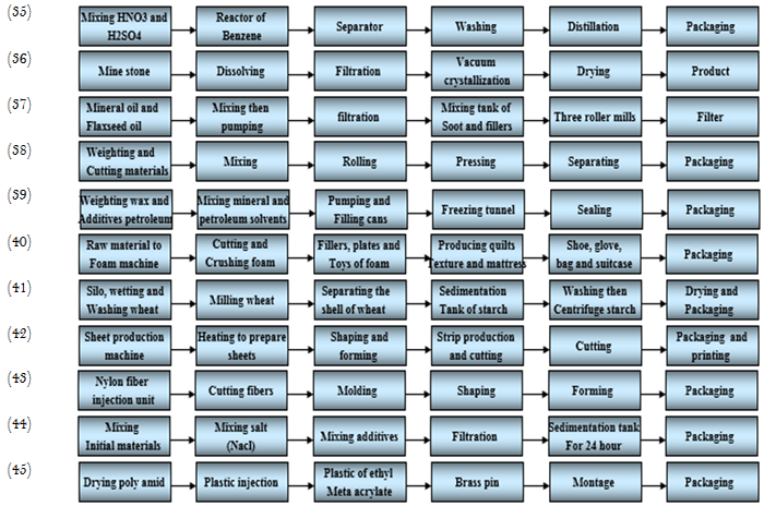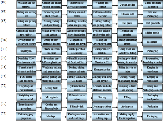 Hassanpour [20] employed fuzzy set theory to classify 21 Iranian plastic industries as a cluster study with the same issues so it was developed a classification as below for them. Congressional sheets of Polypropylene and Polystyrene > Flat sheets of Polypropylene and Polystyrene > Polyvinylchloride flooring > Polypropylene bag > Plastic bottle > Polyethylene pipes and fitting > Plastic waste recycling > Polyvinylchloride film for agricultural use > Plastic shaver > Plastic bags > Plastic rope > Polyvinylchloride shoe bed > Cellular Plastic Sheets > Polyvinylchloride pipes and joints > Plastic flashlight = Plastic buttons > Plastic Box (Fruit, Chilli) > Polyvinylchloride hose > Plastic welding artifacts > Polyvinylchloride gum > Plastic products.