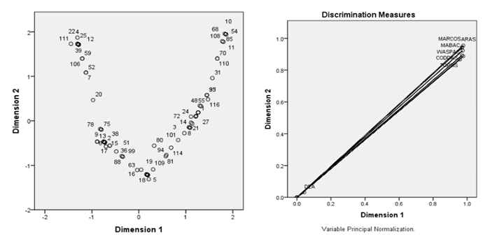 According to Table 3 the highest correlation among ranking models of TOPSIS, CODAS, MARCOS, MABAC, WASPAS, ARAS and SAW were approached about 0.970 (TOPSIS-MARCOS models), 0.998 (MABAC-MARCOS), 0.998 (MARCOS-MABAC), 0.988 (MARCOS-WASPAS), 0.982 (CODAS-ARAS) and 0.982 (CODAS-SAW). The pair test analysis had shown a significant difference around (p-value ≤0.014) between values of SAW-DEA. The t-test analysis was revealed a significant analysis of (p-value ≤0.003) among values of TOPSIS, CODAS, MARCOS, MABAC, WASPAS, ARAS, SAW, and DEA. While there is no significant difference with recede the values of DEA. The distribution of values for TOPSIS, CODAS, MARCOS, MABAC, WASPAS, SAW, ARAS, and DEA were obtained the same based on related-samples Friedman's two-way analysis of variance by ranks. Therefore, the Null hypothesis was rejected. While the distribution of values for TOPSIS, MARCOS, MABAC, and WASPAS came into view normally based on a one-sample Kolmogorov Smirnov test. That is why it resulted to retain the null hypothesis. Figure 3 shows the object points labeled and discrimination measures for variable principal normalization of above-named models in 2 dimensions.
