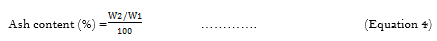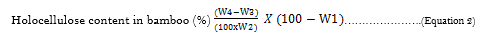 A two-gramme sample of oven-dried extractive-free bamboo was weighed and placed into a 250 ml flask with a small watch glass cover. The crucibles were then oven-dried at 103 ± 2°C, then cool in a desiccator, and weigh until a constant weight was reached [11].