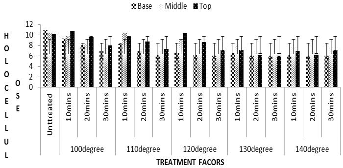 The experiment was of three factors; Culm sampling height (sampling height base (10%), middle (50%) and top section (75%).; Temperature variation and Time duration with their levels; (0°C), 100 °C, 110°C, 120 °C, 130 °C, 140 °C; 10minutes, 20minutes and 30minutes, respectively. The treatment samples were experimented under the listed above factors with 5 replicates to give a total of 270 test samples for each of the Chemical properties (including Hemicellulose contentAlpha-cellulose content, Klason lignin content, hot Ash content, Holocellulose content design adopted was a 3x3x6 factorial in a completely randomized design. Duncan Multiple Range Test (DMRT) was used to separate the treatment means where significant differences occurred in the ANOVA.