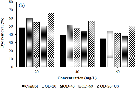 Figure 2(b) shows the percentage of dye removal for all the adsorbents at different level of dye concentrations. As the concentration of dye solution increased, the percentage of dye removal by the adsorbent reduced. The dye removal percentage of untreated orange peel at 20 mg/L dye concentration shows 23% and 38% higher than 40 mg/L and 60 mg/L dye concentration respectively. The percentage of dye removal for orange peel with OD treatment is always higher compared with untreated orange peel at all the dye concentrations. It is observed that OD-20 has the highest percentage in dye removal compared to other OD treatment with different brix level. It shows about 23 – 30% higher than the control at dye concentration between 20 – 60 mg/L. Moreover, the percentage of dye removal of OD-20 has further increased about 10 – 13% for dye concentrations between 20 – 60 mg/L with the assistance of ultrasound.