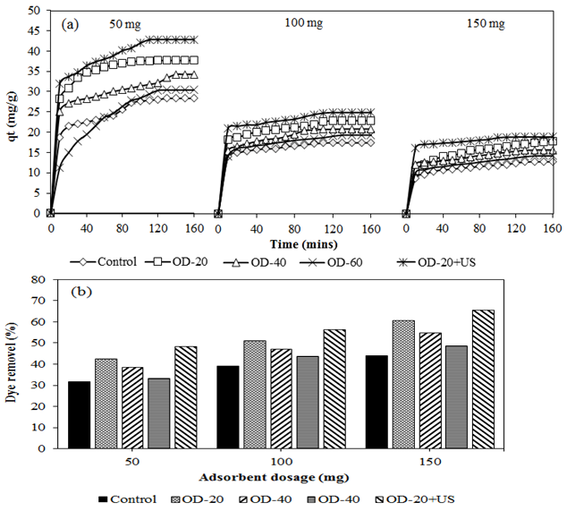 Figure-3. (a) Adsorption capacity and (b) percentage of dye removal for adsorbent with different pre-treatment at adsorbent dosage of 50, 100 and 150 mg.