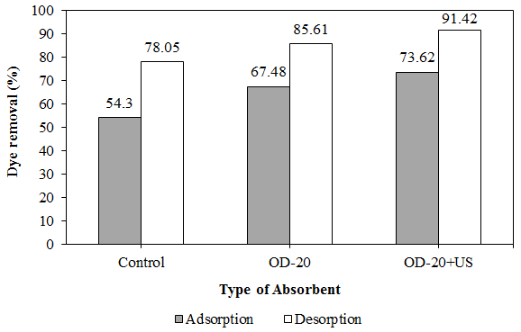 Figure 3(a) shows the adsorption capacity of adsorbent with different pre-treatments in 40 mg/L of dye solution decreased when the adsorbent dosage increased from 50 mg to 150 mg. When the dosage of adsorbent increases, the number of active sites on the adsorbent structure will also increase, thus increases the opportunity for the dye particles to bind with the adsorbent, hence lead to higher percentage of dye removal as showed in Figure 3(b) [22]. However, the adsorption capacity of the adsorbent during the equilibrium is depends on the ratio between the active site to the concentration of dye in the solution. Lower dosage of adsorbent shows higher adsorption capacity at the end of the adsorption process as most of the active sites are filled with dye particles after the adsorption, while higher dosage of adsorbent shows lower adsorption capacity as the ratio of active sites availability in the structure is higher than the amount of dye particles to be adsorbed in the solution. Higher dosage of adsorbent gave dramatic positive impact on decolorization and shows a direct proportional relationship between the adsorbent dosage and the percentage of dye removal [23]. The adsorbent pre-treated with lowest brix of hypertonic solution gave the highest percentage of dye removal as showed in Figure 3(b). At the highest dosage of 150 mg, OD-20 pre-treated orange peel indicated the highest increased about 37% compared to the control. Whilst with the assistance of ultrasound, OD-20+US pre-treated orange peel had further increased the dye removal percentage about 49% compared to the control.3.4. Desorption Study