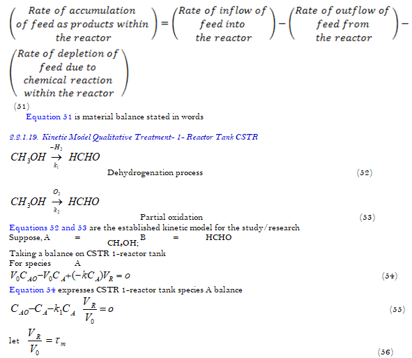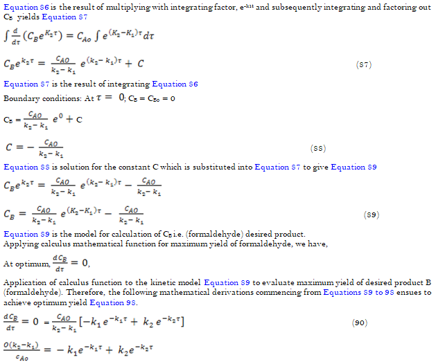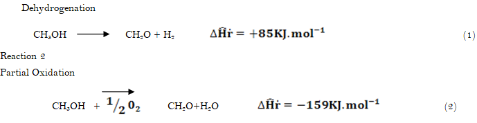 The kinetics according to Equations 1 and 2 above are two main process for formaldehyde production; dehydrogenation and partial oxidation reactions according to Jilesh and Linesh [7] kinetic literature data adapted for the research.