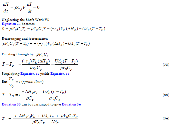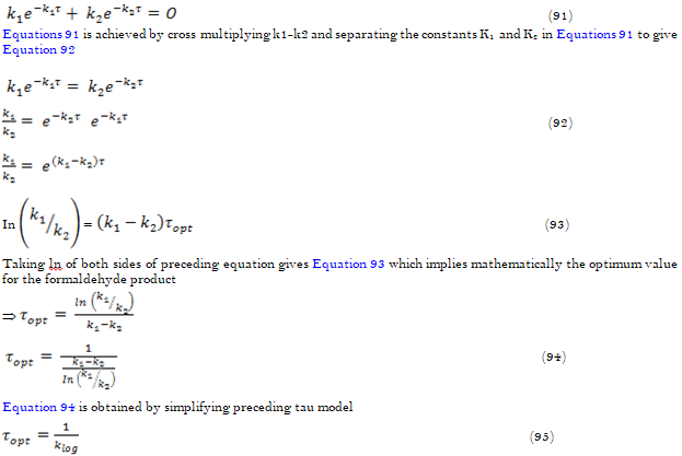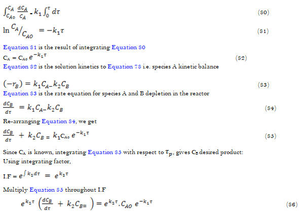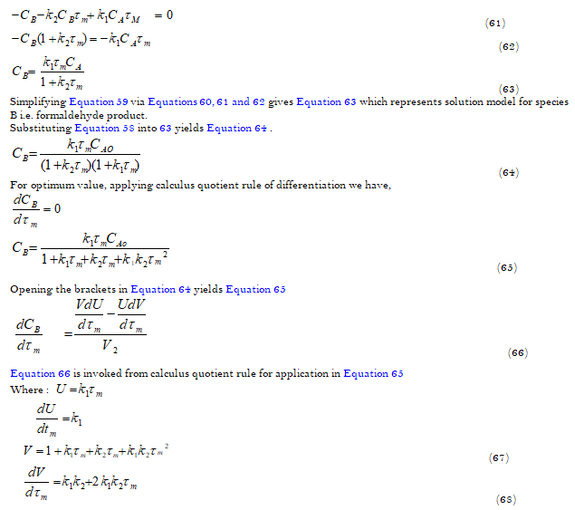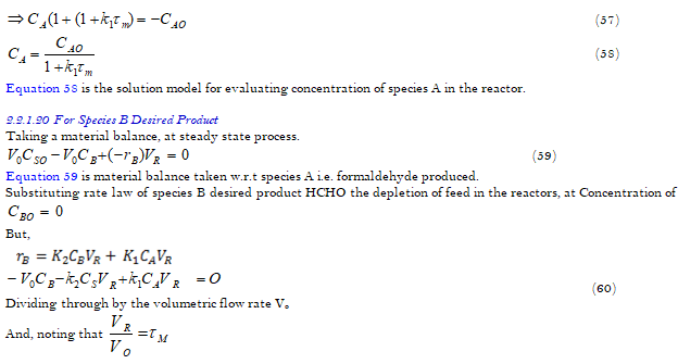 Equation 56 represent the space time parameter in the material balance Equation 55 which is simplified to give Equation 57.
