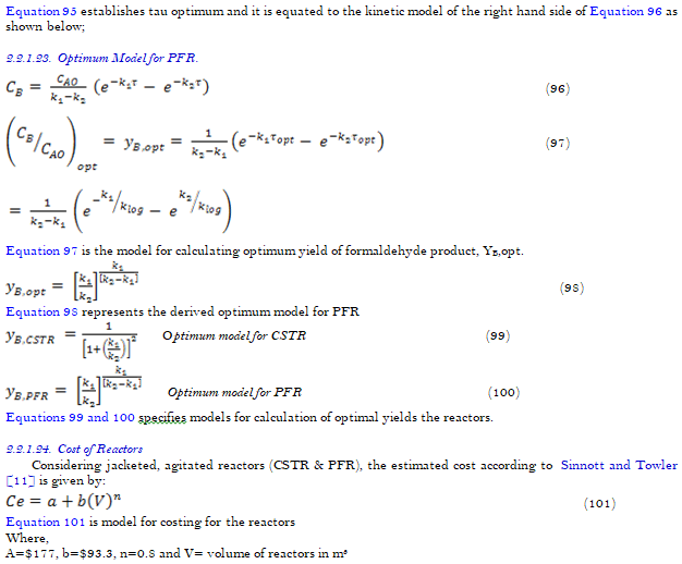 The results of optimal kinetic model yields Yopt of CSTR 1 - reactor tank and Plug flow reactor PFR showed that the yields obtained for the two reactors are 69% and 87% and compare favorably with operational yields of the production process which stood at 78.5 and 80.1 percent. From the results PFR provide a better volume for the production of formaldehyde at 87% conversion. The cost of the reactors was also developed to obtain the results and MATLAB program was used to simulate the design models developed.