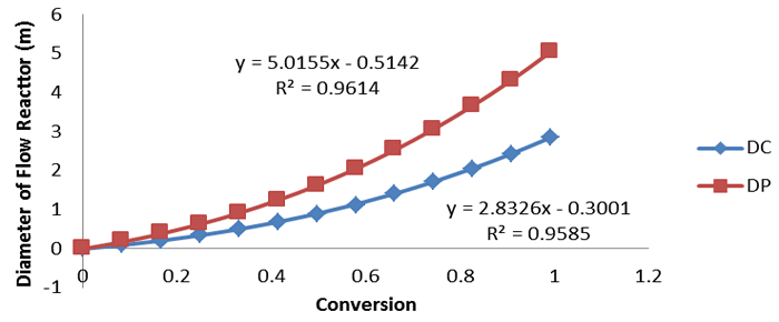 Figure-13. Variation of Diameter of Flow Reactors versus Conversion.