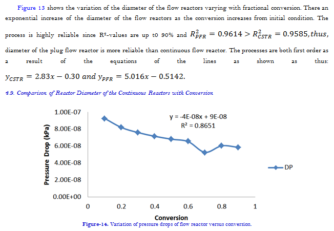 Figure 14 shows the variation of pressure drop with conversion. This parameter is only affected by packings along the tubular flow of the reactor, not continuous stirred tank reactor. The pressure drop variation is due to configuration of the plug flow reactor. The pressure drop decreases as fractional conversion increases.