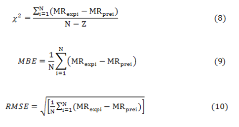 The fitness of experimental data was evaluated using statistical analysis. The Statistical parameters such as: Mean Bias Error (MBE), Root Mean Square Error (RMSE) and reduced Chi-square error (x2) were estimated using the following mathematical expressions in Equations 8-10. The x2 values for all sample thickness at all temperatures for each model was estimated by substituting the MRexp and MRpre into Equation 8. Also, the MBE values were obtained by substituting MRexp and MRpre into Equation 9. Furthermore, the RMSE values were obtained by substituting MRexp and MRpre into Equation 10. The best fit was determined by the coefficient of correlation R2.