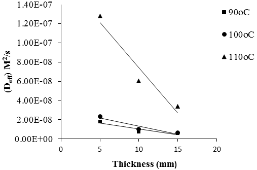 From Equation 7, the Deff of the samples were calculated from the slope, k. Then Deff data obtained was plotted against sample thickness to investigate the relationship between Deff and sample thickness.