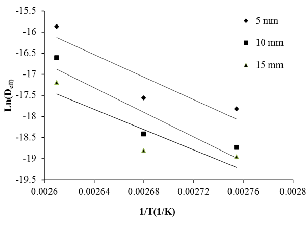 Where Do is the pre-exponential factor, Ea is the activation energy, T is the temperature for drying and R is the universal gas constants. From the plot of ln(Deff) against 1/T (Figure 5), activation energy can be obtained from the equation of the line. From the slopes of the straight lines and the intercept in Figure 5, the activation energies and the pre-exponential factors for the different thicknesses were obtained and presented in Table 4.