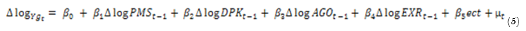Where in (5), all the variables remain as explained in (4), while log is the logarithm value of the variables, β0 is the constant of the model, β1 - β5 are all slopes of the estimates, t is the time (yearly trend) and t-1 is the yearly lag period (one yearl0.